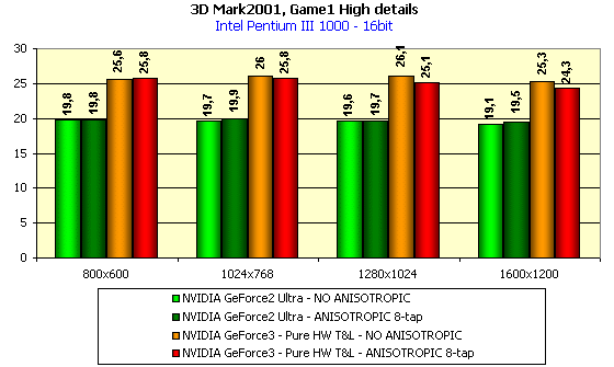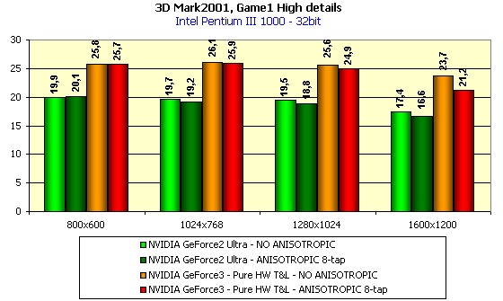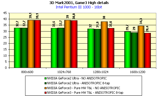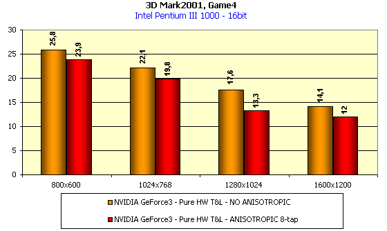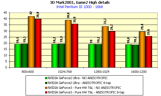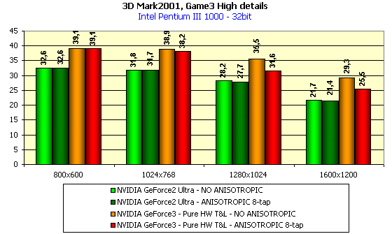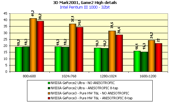 А вот в данном случае падение производительности у GeForce3 при активизации анизотропии весьма высоко! А его почти нет у GeForce2 Ultra.