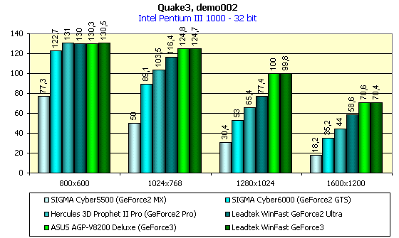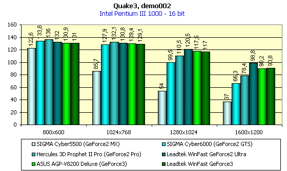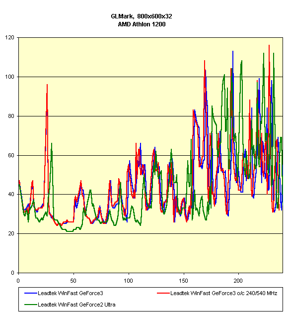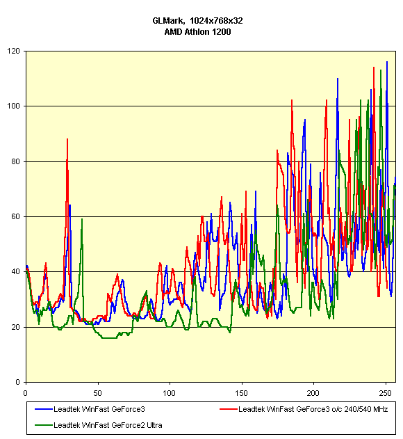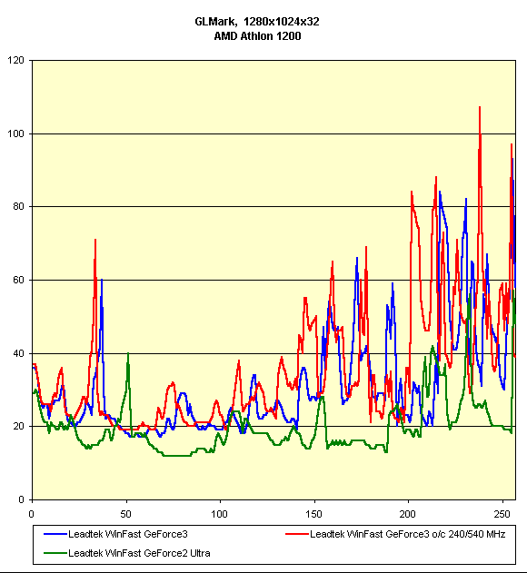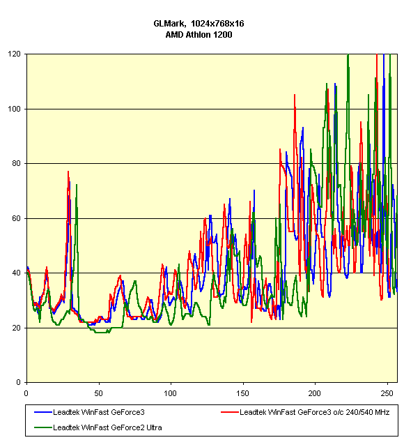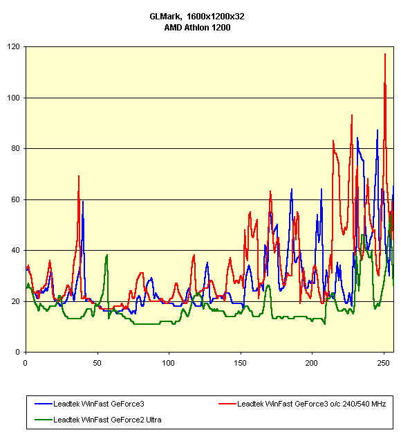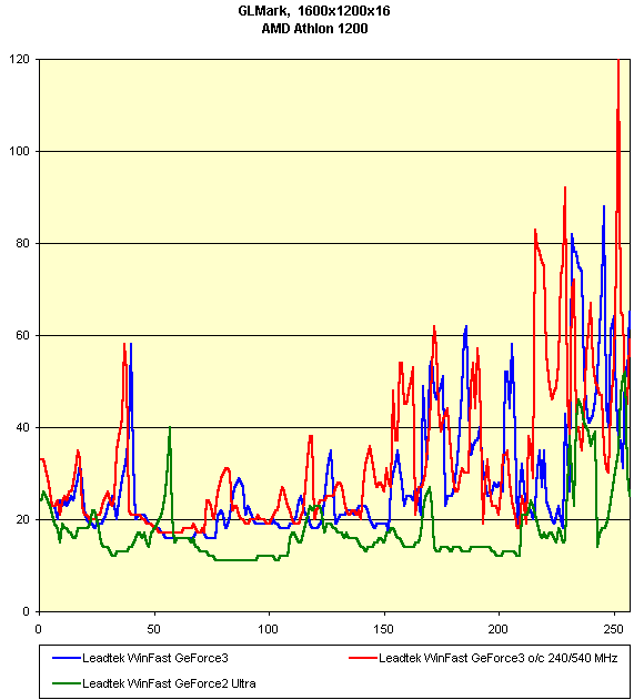 Видно, что различий между работой Leadtek WinFast GeForce3 на номинальных частотах и разогнанных нет, а Leadtek WinFast GeForce2 Ultra подчас опережает карту на GeForce3 в 16-битном цвете.