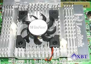 Как я уже говорил ранее, в новом дизайне (это относится ко всем картам на GeForce3) модули памяти расположены ближе к графическому процессору, поэтому боковые радиаторы частично как бы залезают под центральный. И даже WWW-адрес сайта фирмы, выгравированный на радиаторах (на фотографии выше справа) прячется под центральным огромным радиатором. Такая форма охлаждающего GPU устройства свойственна картам от Leadtek уже практически год, с момента выхода карт на GeForce2 GTS.