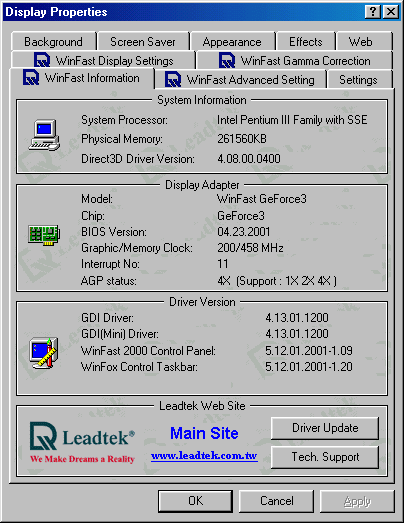 Возвращаясь к Leadtek WinFast GeForce3, мне хочется еще раз отметить, что фирма-производитель держит марку и выпускает продукты только отличного качества.