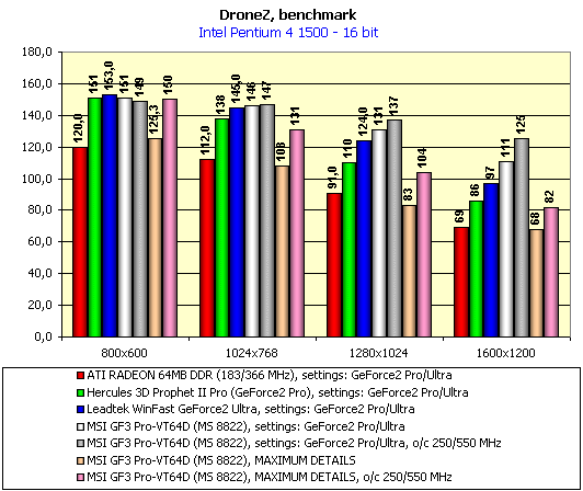 На этот раз мы проведем испытания MSI GF3 Pro-VT64D с помощью давно используемого в Сети, но лишь недавно официально вышедшего теста DroneZmark, который является составной частью новейшей игры DroneZ (эта игра официально еще не анонсирована, однако в ОЕМ-поставках уже встречается, например, ее можно увидеть в комплекте поставки карты Leadtek WinFast GeForce3 TDH, которую мы недавно исследовали).