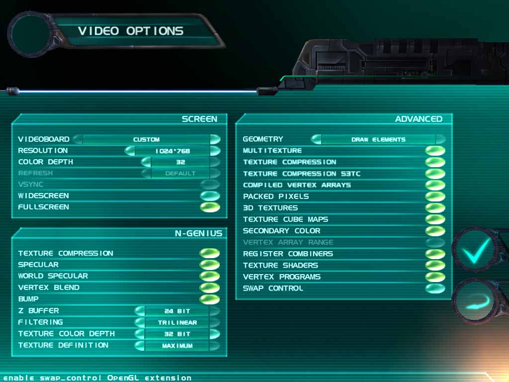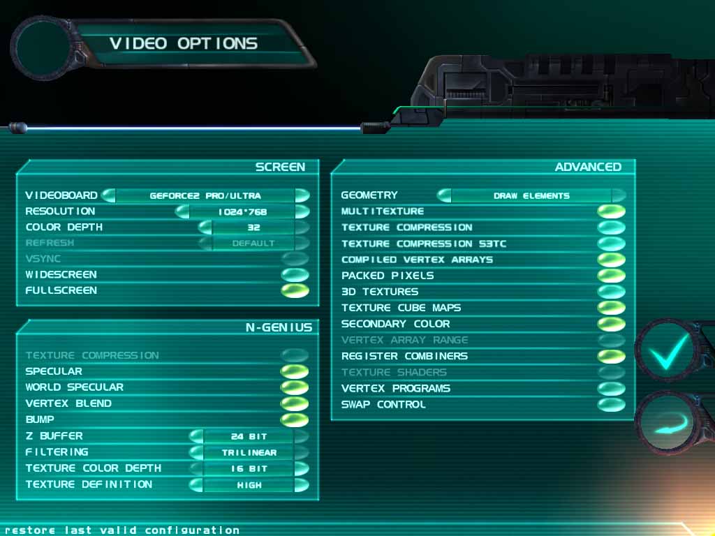 Эта игра (и, соответственно, бенчмарк) базируется на OpenGL, изобилует эффектами и сложностью графики. В настройках бенчмарка есть возможность использовать как самостоятельно выбираемые настройки, так и пресеты. Я использовал для тестирования пресет GeForce2 Pro/Ultra (конфигурацию можно увидеть на левом скриншоте) на этих настройках тестировались все используемые в этом материале карты. А также я использовал установки на максимум, то есть по возможности задействовал все 3D-функции и детализации, которые имеются в данной игре (эти настройки можно увидеть на правом скриншоте).