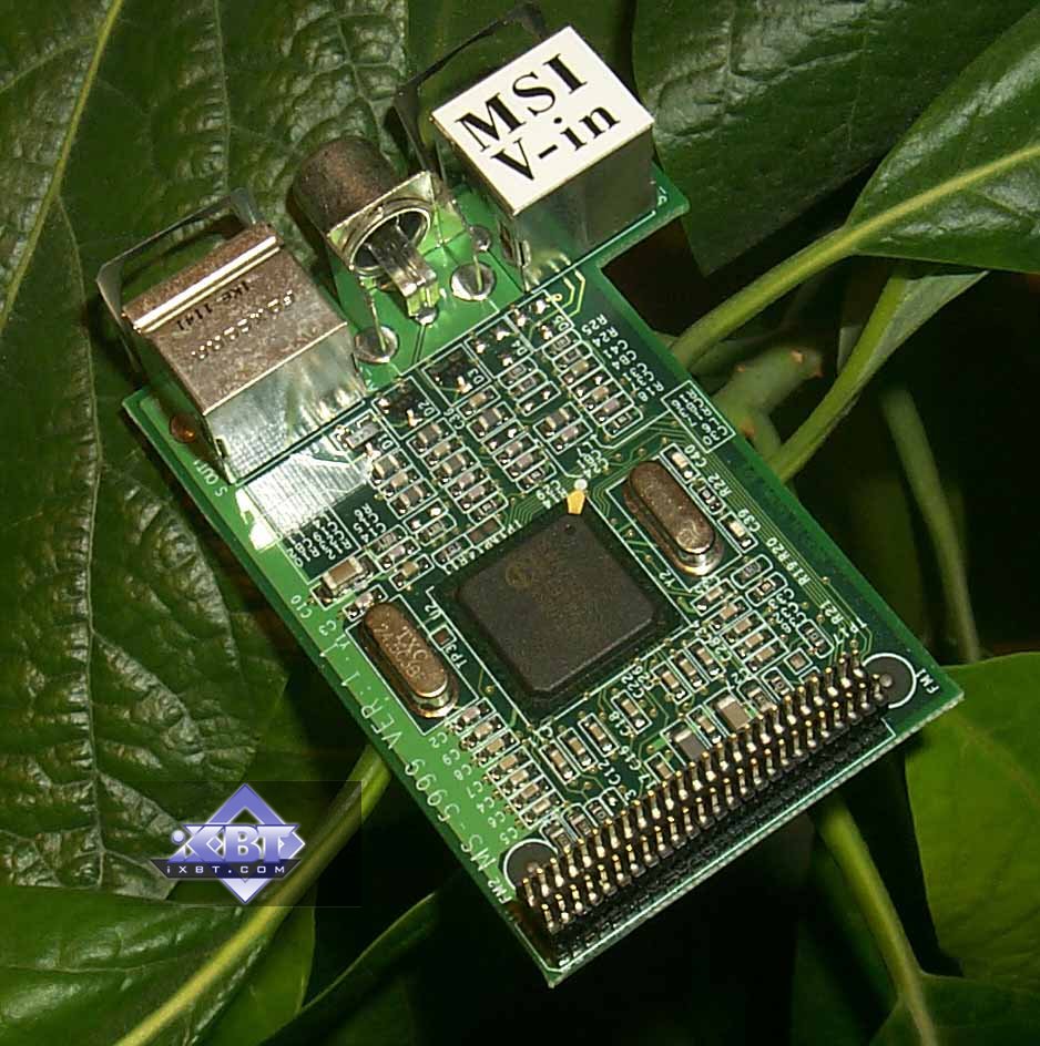 Очень хорошо видно, что MSI GF3 Pro-VT64D полностью повторяет эталонный дизайн, различие состоит лишь в установленной дочерней плате с VIVO. Похожую платку со смонтированным на ней устройством для приема и оцифровки аналогового сигнала, а также вывода изображения на телевизор мы могли видеть на GeForce3-карте от Gainward. Кодированием сигнала в обе стороны занимается модуль Philips из серии 7100 (представляющий собой ЦАП и АЦП вместе). С одной стороны, использование такого универсального процессора удешевляет производство подобных дочерних карт и увеличивает массовость выпуска видеокарт, снабженных VIVO. С другой стороны, на примере ASUS V8200 Deluxe, Gainward GeForce2 MX400, Gainward GeForce3 VIVO, MSI GeForce2 MX400 карт мы уже убедились в том, что встроенная в чип от Philips защита от копирования подчас весьма неразборчива в том, что можно, а чего нельзя копировать, и иногда даже любительские видеокассеты воспринимает как лицензионный продукт и портит картинку при оцифровке (это хорошо видно по дерганию кадров при показе видеоролика еще до записи его на диск). Поэтому мы можем рассчитывать лишь на то, что это проблема ПО от NVIDIA, которая в будущем будет исправлена.