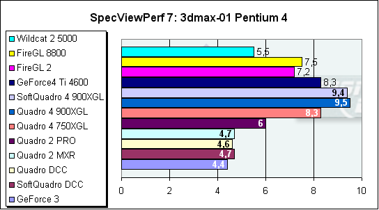 Последний тест помогает нам окончательно определиться. Игровые карты - это игровые карты, а новый SpecViewPerf это не игрушки. Что и видим - игровые карты и SoftQuadro в этом тесте ничего не могут противопоставить своим старшим собратьям. Лидером остается Quadro 4 900XGL. Совсем рядом FireGL 8800.