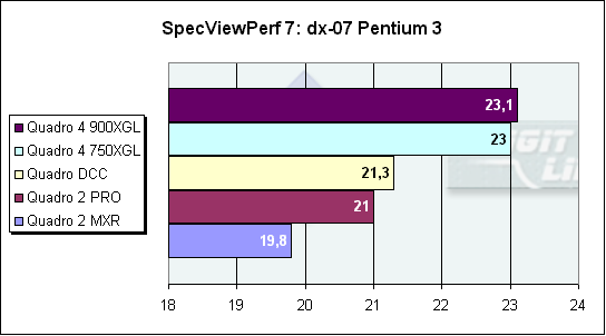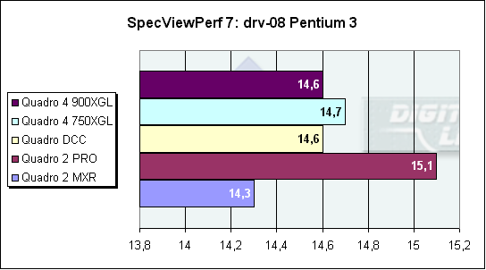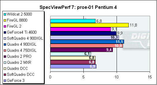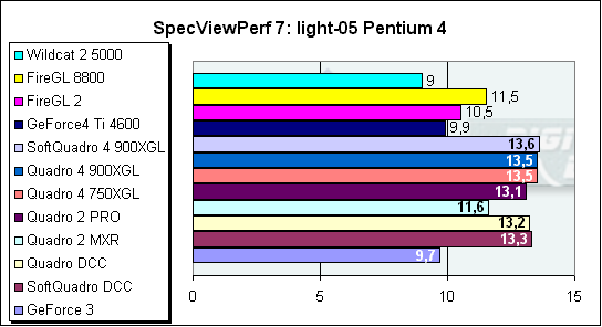 И в этом тесте цифры стали более разумными и исчисляются полутора десятками fps. Тест стал более современным, в том плане, что общая нагрузка на акселераторы увеличилась, и, как следствие, количество fps несколько упало. Да, поклонники ATI могут возрадоваться -- наконец-то лидерство перехватывает FireGL 8800. Пусть небольшое, пусть на чуть-чуть, но лидерство, и это факт.