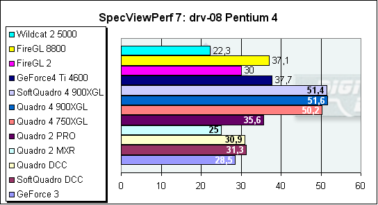 И в этом тесте лидируют карты Quadro 4. Причем, как можно видеть, SoftQuadro 4 практически не уступает настоящим Quadro 4, а SoftQuadro DCC даже немного быстрее настоящей Quadro DCC. Карты от ATI держатся "золотой середины" между флагманскими картами и самыми младшими моделями от NVIDIA. Wildcat в этом тесте не показал ничего примечательного.