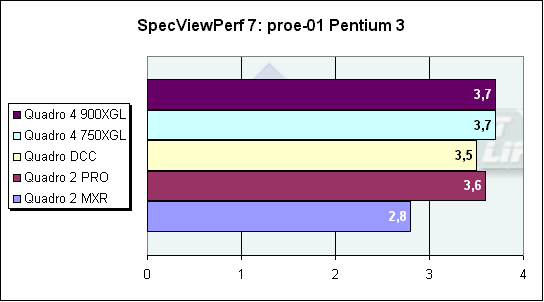 Вполне достойный тест для достойных карт. Разработчики в этой версии SPECviewperf добились, на мой взгляд, того необходимого баланса, который и определяет качество и скорость работы карты. Как видите, тест от процессора зависит мало, заставляя "работать" видеоускорители. Новые алгоритмы и оптимизация тестов именно под современные ускорители дают нам следующую расстановку сил. Непревзойденными остаются карты от NVIDIA из линейки Quadro 4. Где-то рядом располагается карта от ATI FireGL 8800, а после FireGL 8800 идут все остальные карты, причем практически "ноздря в ноздрю". Игровые же карты во многих тестах показали, что не способны справляться с профессиональными задачами.