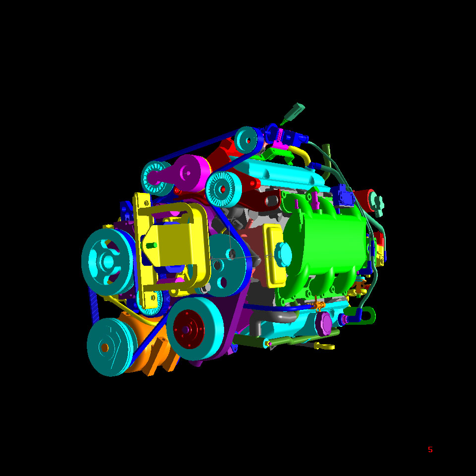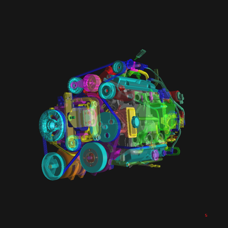 Модель движка была взята из SPECapc для теста приложений Unigraphics. Измеряются 3 режима визуализации с закраской, с закраской и прозрачностью и каркасный. Каркасные рабочие нагрузки измеряются как в нормальном, так и в режиме сглаживания. Все тесты проводятся дважды, сначала вращение в центре экрана и затем движение по кадру для измерения производительности отсечения.