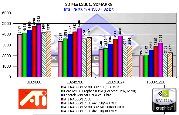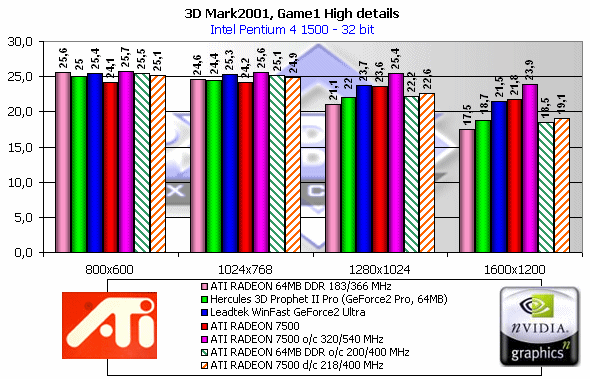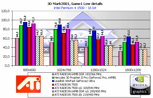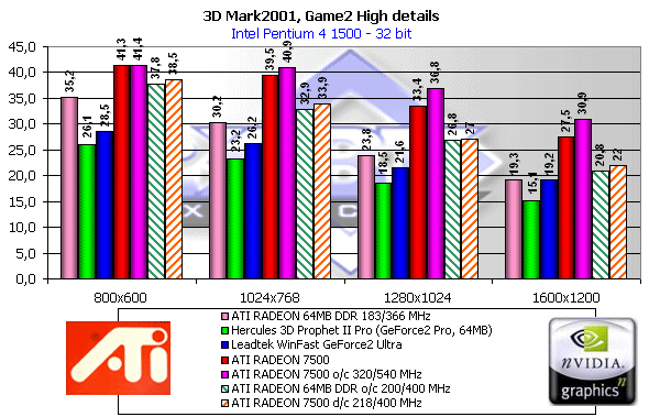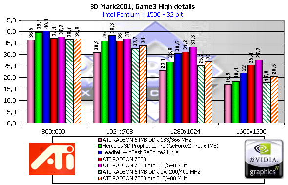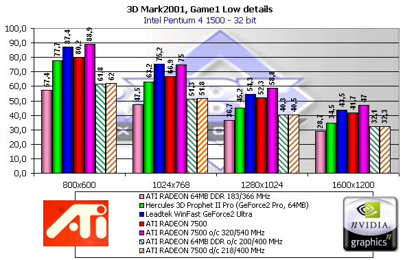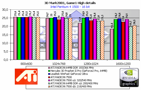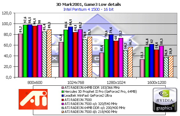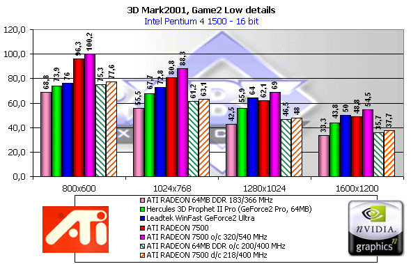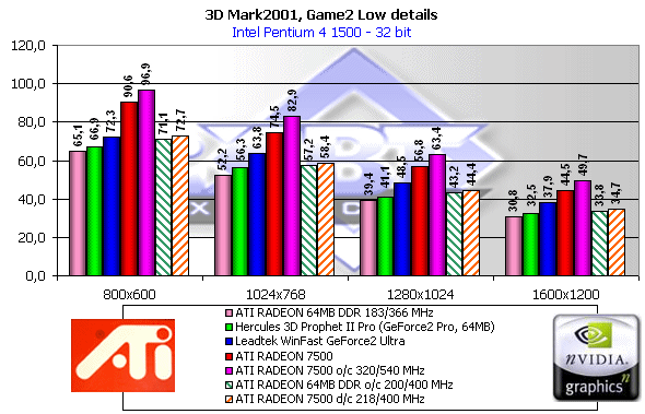 Как мы видим, если судить по тесту в целом, то RADEON 7500 — просто молодец! Однако, посмотрим на каждый из игровых тестов, поскольку "попугаи" в 3DMark2001 — не самая объективная оценка.