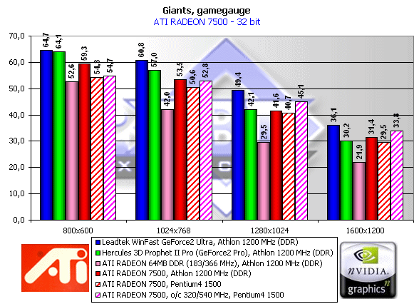 Учитывая, что Giants это одиночная игра, где не нужны сотни FPS, можно сказать, что RADEON 7500 отлично подходит для игры в Giants в 32-битном цвете. Нареканий на качество нет.