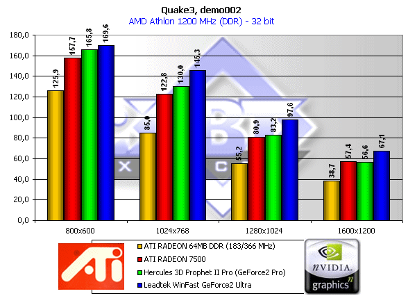 Хорошо видно, что в 16-битном цвете RADEON 7500 сильно проигрывает конкурентам от NVIDIA (и даже разгон не помогает), но зато в 32-битном цвете продукт от ATI уже в разрешении 1024х768 догоняет GeForce2 Pro, а при разгоне даже GeForce2 Ultra. Учитывая достаточную мощь рассматриваемых карт, можно с большой уверенностью предположить, что 32-битный цвет станет наиболее используемым в 3D.