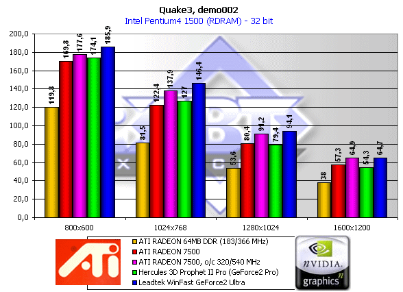 У RADEON, несмотря на его архитектуру, схожую с GeForce2 MX, есть неоспоримое преимущество: оптимизация работы с памятью. Да, речь идет о HyperZ, технологии, которая помогает экономить пропускную способность видеопамяти. Поэтому мы видим превосходство RADEON с SDR-памятью над соответствующим ему по ценовой шкале GeForce2 MX в 32-битном цвете. Да, разумеется, работающий на более низкой частоте RADEON DDR (166 МГц против 200 у GeForce2 GTS) проигрывает последнему, но, тем не менее, в 32-битном цвете уже вплотную подбирается к нему. И это при такой "урезанности" архитектуры относительно 4-х конвейеров и 8-ми TMU у GeForce2! Поэтому выпуск на рынок более новой версии ТОГО ЖЕ RADEON DDR позволит ATI выставить конкурента уже не GeForce2 GTS-картам (тем более, что они уже сходят с рынка), а GeForce2 Pro и даже новинке от NVIDIA GeForce2 Titanium.