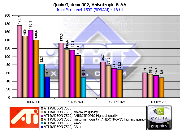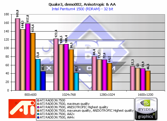 Как известно, еще RADEON GRAPHICS обладал этими функциями. Если в отношении анти-алиасинга можно сказать, что он ничем особым не выделяется (базируется на широко распространенном методе Super Sampling AA), то анизотропия, напротив, всегда привлекала к себе внимание. Давайте посмотрим вначале на производительность при активизации этих функций: