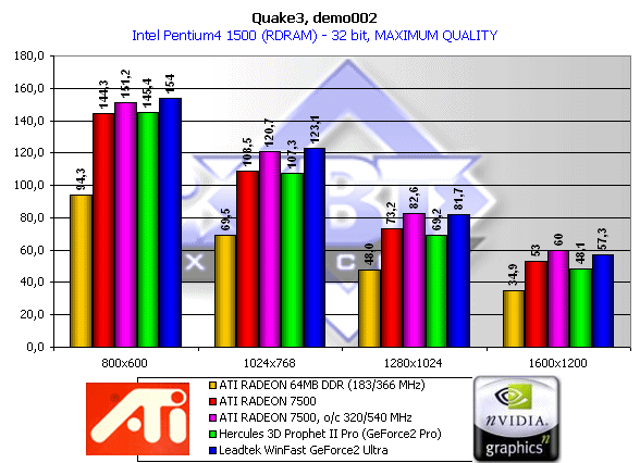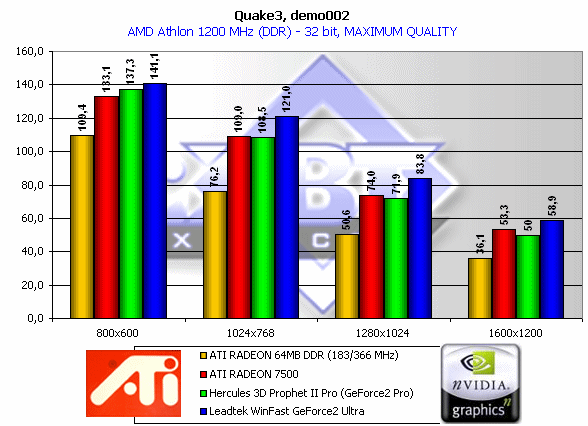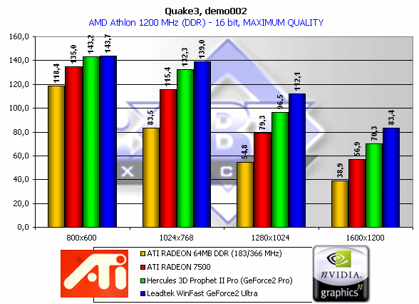 - Hercules 3D Prophet II Pro (GeForce2 Pro, 200/200 (400) MHz, 64MB, использовались драйверы от NVIDIA версии 21.81).