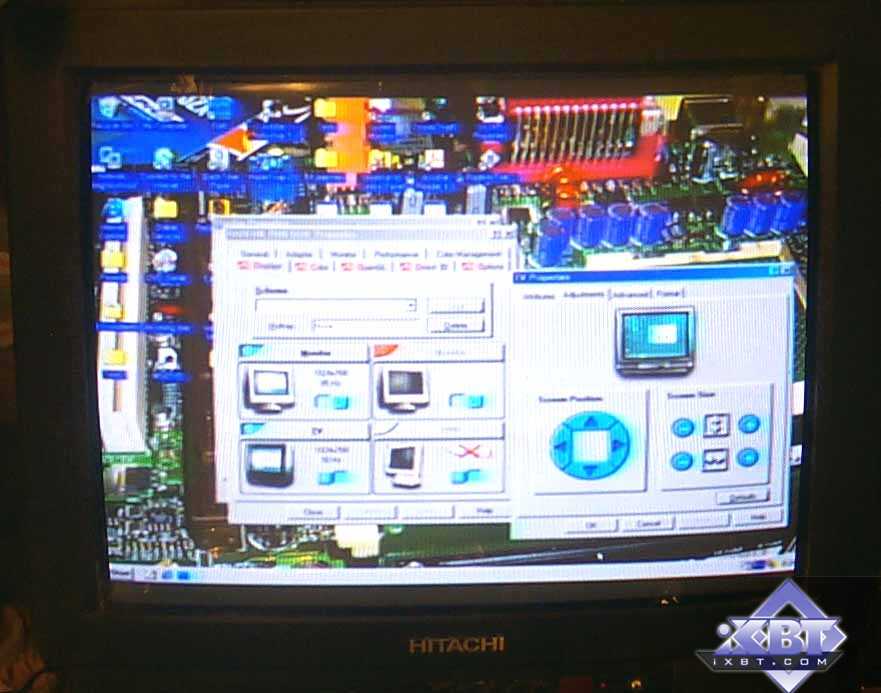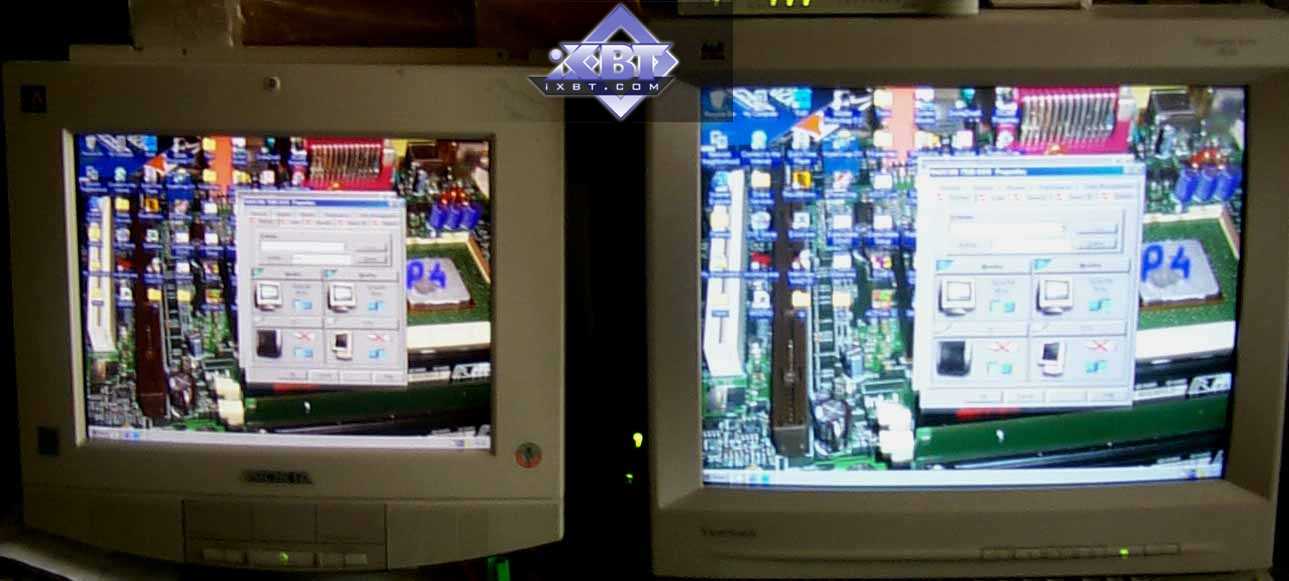Само собой разумеется, мы протестировали вывод изображения на два приемника (кроме вывода на LCD-монитор). Я уже подробно описывал эту технологию в обзоре по RADEON VE, она схожа с той, что мы можем видеть у Matrox G400/G450/G550 и у NVIDIA GeForce2 MX TwinView. Это вывод как на два монитора (поддерживаются режимы копирования одной картинки на два монитора и расширения рабочего стола на второй монитор):