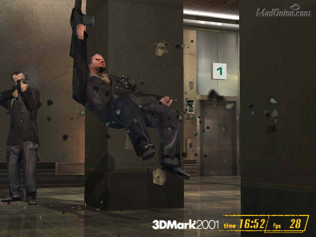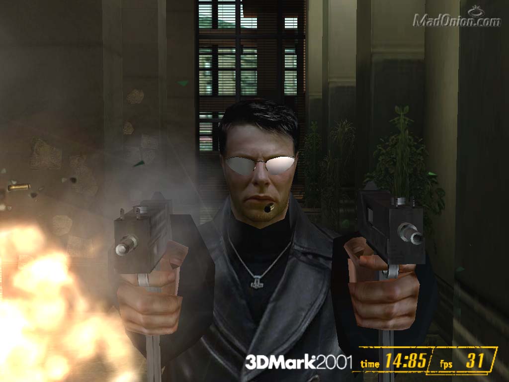Нареканий вроде нет (если не считать немного не понравившейся мне дымки при выстрелах). Интересно отметить, что очень близкой к этой сцене является игра Max Payne, базирующаяся на том же движке, что и 3DMark2001. Посмотрим, а что в ней показывает RADEON 7500. В целом, все нормально, но вот с туманом проблемы: он полосками и какой-то радужно-неестественный.