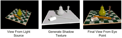 Чтобы сцена в игре выглядела реалистично и имела глубину, применяют моделирование теней. Для наложения естественных теней, отбрасываемых объектами сцены, в Rage6 реализована поддержка специального Priority Buffer (приоритетный буфер). Этот буфер позволяет хранить информацию о том, насколько близко объекты сцены расположены по отношению к точке обзора. В итоге, каждый объект сцены получает весовой коэффициент или приоритет, отсюда и название буфера. При изменении положения объекта относительно точки обзора его весовой коэффициент в буфере приоритета также изменяется. Так вот, для наложения реалистичных теней используется аппаратный priority buffer в паре с проецируемыми текстурами (Projective Textures). Чтобы сформировать тень, за точку обзора (viewpoint) принимается источник света, и вся сцена рендерится с учетом весовых коэффициентов из буфера приоритета, т.е. самый близкий к источнику света объект рендерится в первую очередь, т.к. имеет наивысший приоритет. Теневая текстура формируется путем рендеринга силуэта каждого объекта, а затем осуществляется проецирование сформированной текстуры, и в сцене получается тень. Этот метод проще и эффективнее, чем использование традиционного буфера шаблонов.