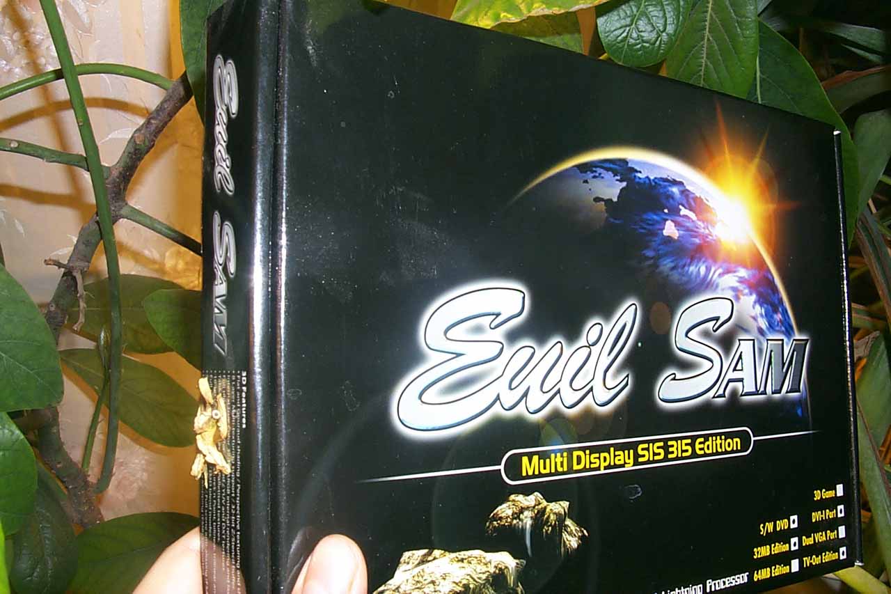 Карта PowerColor Evil SAM имеет AGP x2/x4 интерфейс, 32 Мб SDR SDRAM памяти, размещенной в 4-х микросхемах на лицевой стороне PCB.