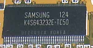 Микросхемы памяти марки Samsung, время выборки 5 ns, что соответствует 200 МГц. Видеокарта работает на частотах 166/166 MHz.