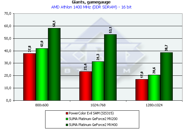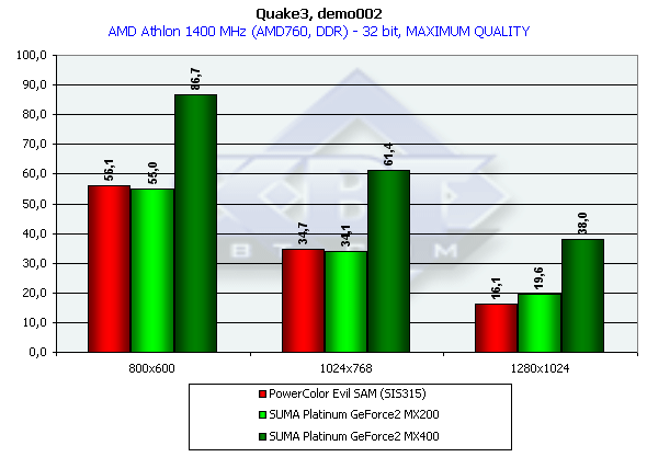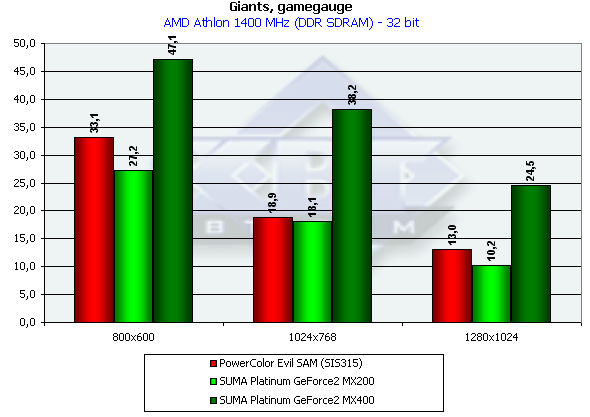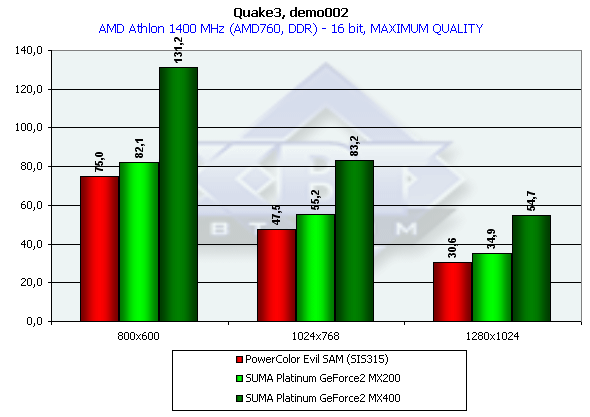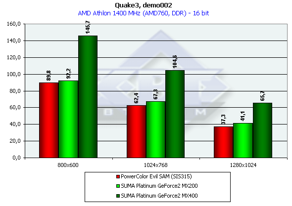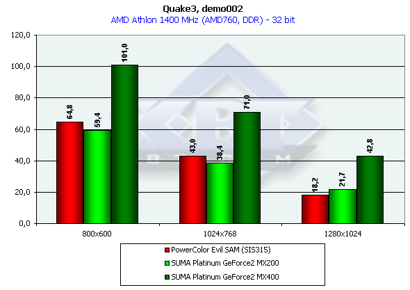 Наглядно видно, что видеокарта на базе SiS 315 соответствует уровню GeForce2 MX200. То, что я выше предсказал, когда рассматривал архитектуру SiS 315, оно и вышло. Чип не спасла 128-битная шина обмена с памятью, наличие всего лишь двух текстурников поставило SiS 315 на уровень NVIDIA TNT2 Pro/Ultra чипов. И именно схожую производительность мы и получили.