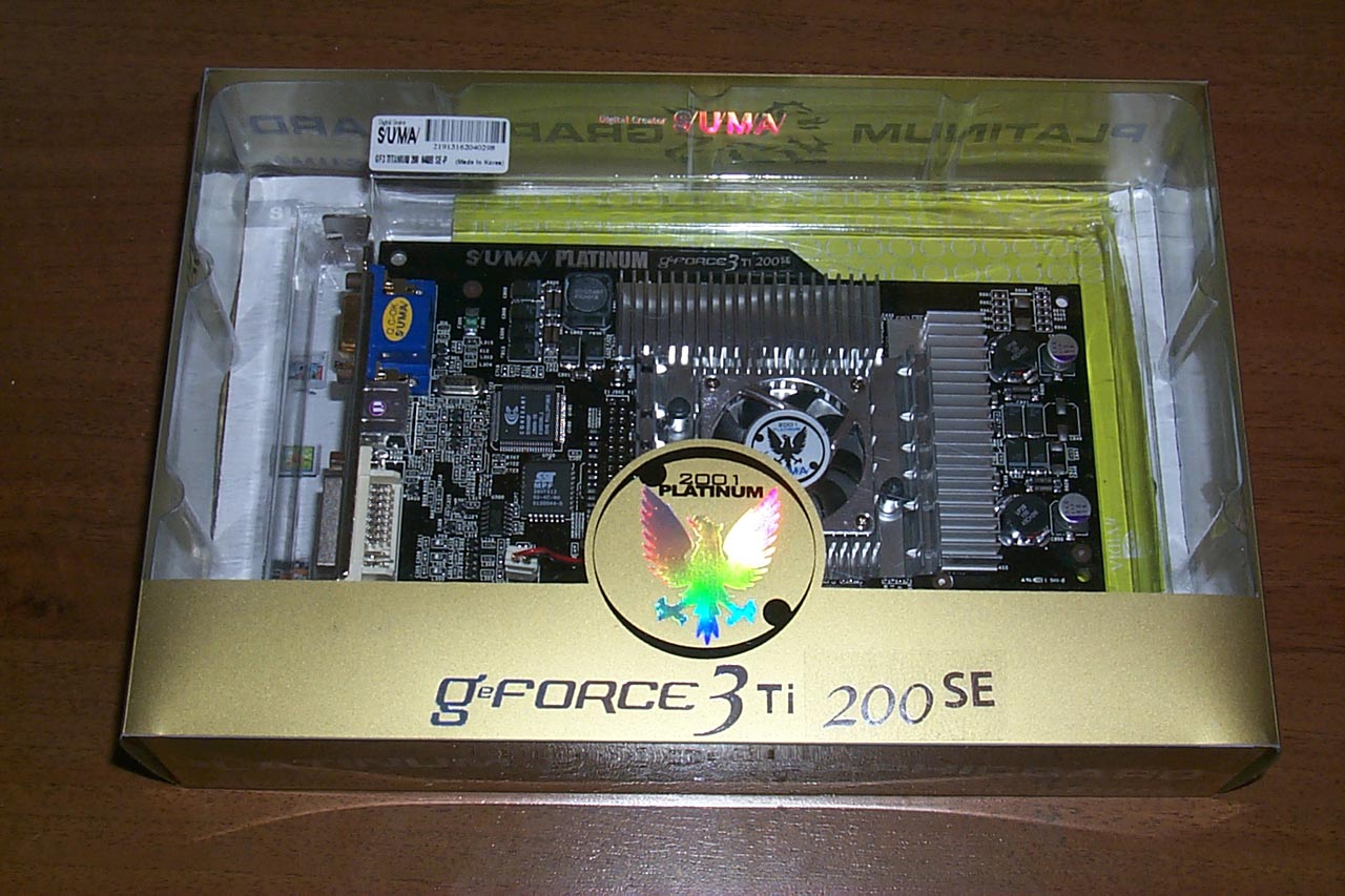 Карта SUMA Platinum GeForce3 Ti 200SE имеет AGP x2/x4 интерфейс, 64 МБ DDR SDRAM памяти, размещенной в 8-ми микросхемах на лицевой стороне PCB.
