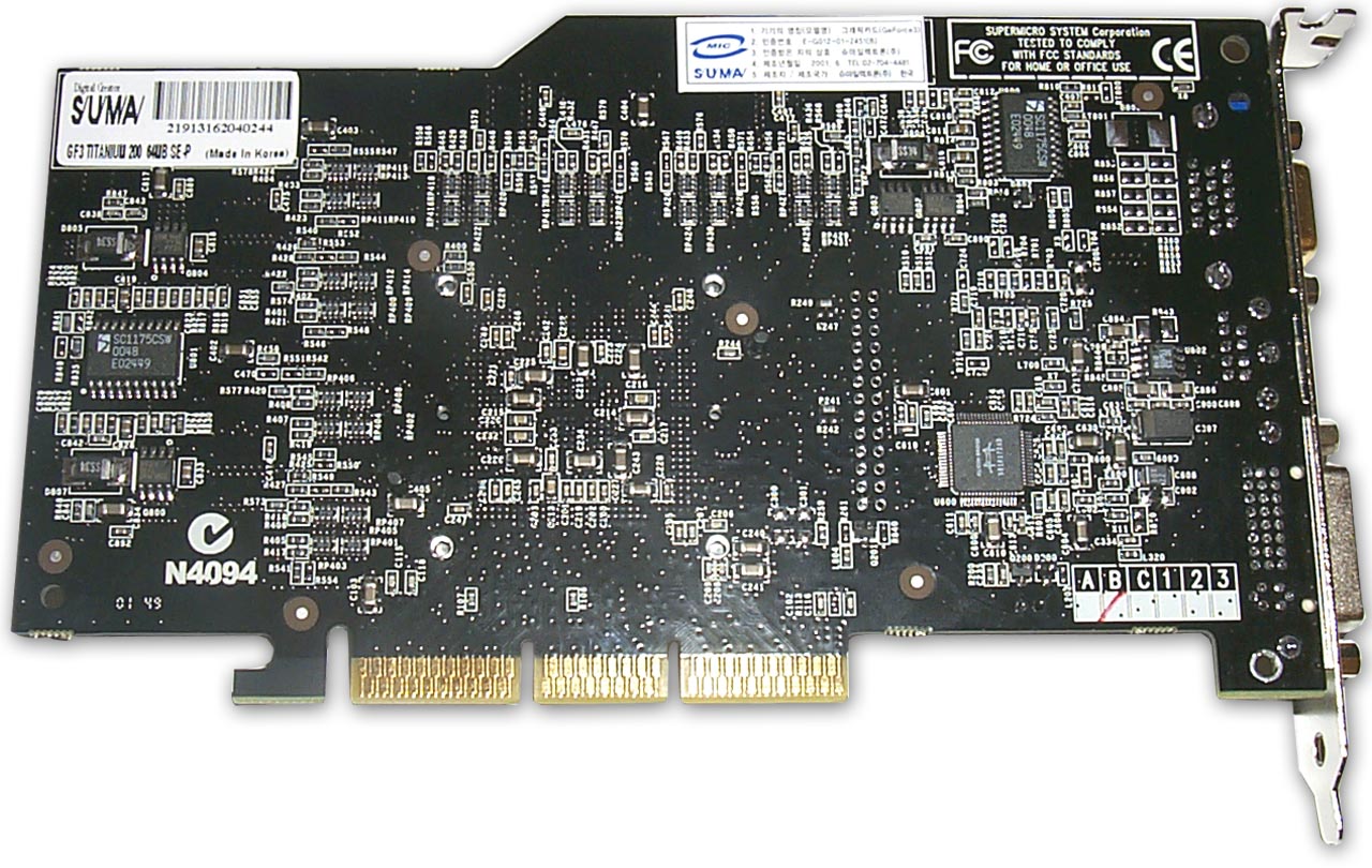 Наряду с изменением дизайна карт на базе GeForce3 Ti 500, NVIDIA внесла изменения и в дизайн плат на базе GeForce3 Ti 200, значительно его упростив (ведь такие платы не требуют сверхвысоких частот работы памяти). Однако SUMA при выпуске Platinum GeForce3 Ti 200SE пошла по пути использования более дорогого дизайна от Ti 500 (8-ми слойная PCB). Это и понятно, ведь на карте установлена 3.6ns память, поэтому для устойчивой работы такой памяти на частотах, хотя бы близких к номиналу (275 МГц), нужна более тщательная разводка и сложной конструкции PCB.