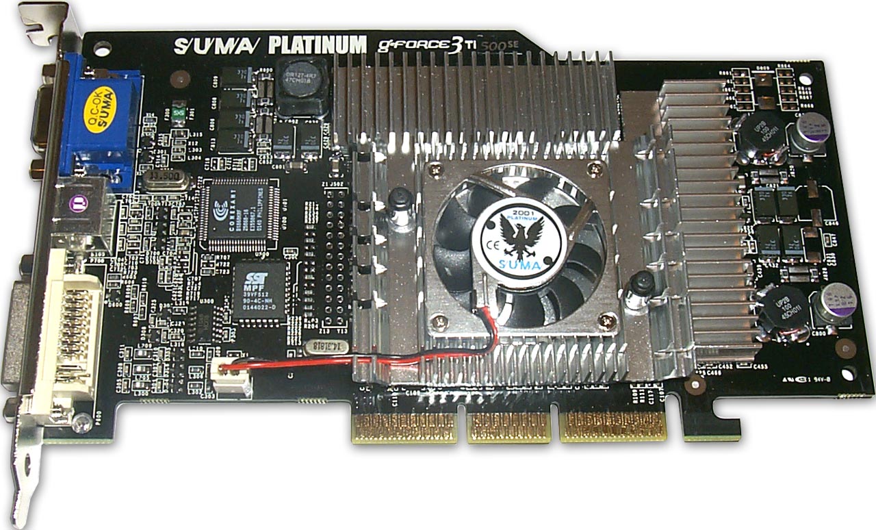 - SUMA Platinum GeForce3 Ti 500SE полностью соответствует reference card по всем параметрам, имея при этом чуть более высокую частоту работы памяти (разумеется, гарантированную производителем), а карта на базе Ti 200 изготовлена на такой же PCB (c доведенным до ума потенциалом по разгону).