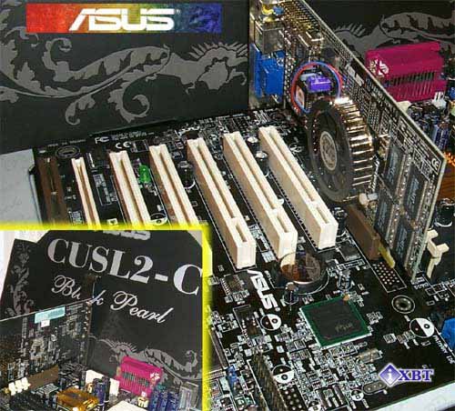 На этом особенности не заканчиваются. Конечно же, цвет PCB... Это для продукции фирмы ASUSTeK сродни революции. Мы уже очень привыкли к желтому цвету карт и плат от этой фирмы. И поэтому иной окрас PCB очень сильно бросается в глаза, подчас заставляя пользователя сомневаться в подлинности этого изделия. Однако такой способ привлечь внимание покупателей уже был опробован ASUSTeK на системной плате ASUS CULS2-C Black Perl (ее можно видеть на коллаже вверху). И он себя пока весьма оправдывает. Вот и на примере ASUS AGP-V7100 Pro мы можем видеть уже новую традицию — выпускать черные видеокарты.