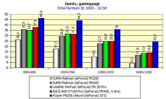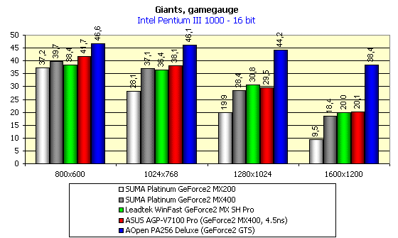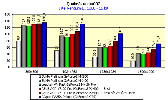 Для сравнительного анализа были использованы показания с видеокарт AOpen PA256 Deluxe (GeForce2 GTS), Leadtek WinFast GeForce2 MX/DVI, SUMA Platinum GeForce2 MX200, SUMA Platinum GeForce2 MX400.