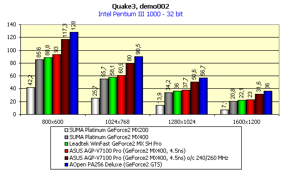 Я напомню, что у SUMA Platinum GeForce2 MX400 частоты равны 200/183 МГц, то есть чуть-чуть ниже, чем у ASUS AGP-V7100 Pro (200/200 МГц). И это в 16-битном цвете практически никак не сказалось, обе карты были равны, и, разумеется, далеко ниже от более старшего брата — GeForce2 GTS. А вот в 32-битном цвете картина уже стала немного иной: 200 МГц по памяти сказались, и ASUS AGP-V7100 Pro вышла на второе место после GeForce2 GTS.