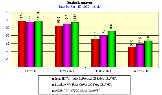 Тестирование на бенчмарке Quaver проводилось в двух режимах: 16-битном цвете и 32-битном цвете. В обоих случаях использовались максимальные установки по качеству (трилинейная фильтрация, максимальный уровень детализации геометрии, ползунок качества текстур установлен в положение 4).
