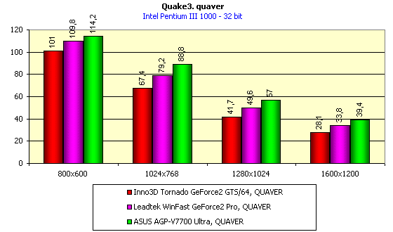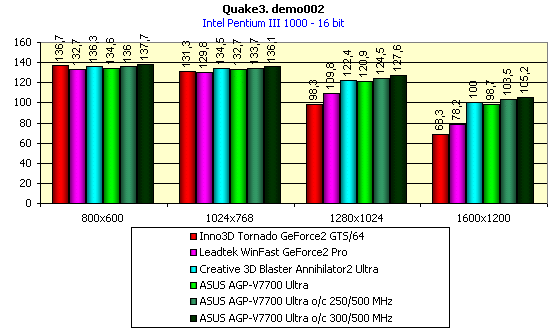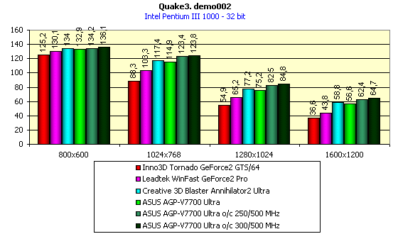 Видно, что результаты вполне прогнозируемые, сильный прирост по скорости относительно соперников оправдывает суффикс "Ultra", карта обеспечивает хорошую играбельность даже в 1600х1200х32, однако в некоторых разрешениях ASUS AGP-V7700 Ultra показал чуть меньшую производительность, нежели предшественник — Creative 3D Blaster Annihilator2 Ultra. Интересно отметить, что прирост по скорости при разгоне не столь существенен из-за того, что 500 МГц памяти уже не хватает для обеспечения потенциала 250 МГц графического ядра, не говоря уже и про 300 МГц.