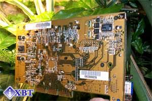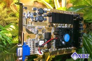 При ближайшем рассмотрении карты можно заметить, что она имеет разъем для присоединения дочерней платы с TV-out. Такое решение позволяет реализовать универсальный коннектор для использования совместно с картой различных дочерних плат с TV-out, TV-in или TV-in/out на борту. В результате, не изменяя эталонный дизайн, производители видеокарт могут выпускать различные модификации, в том числе и целый мультимедийный комбайн. В данном случае коннектор не задействован.