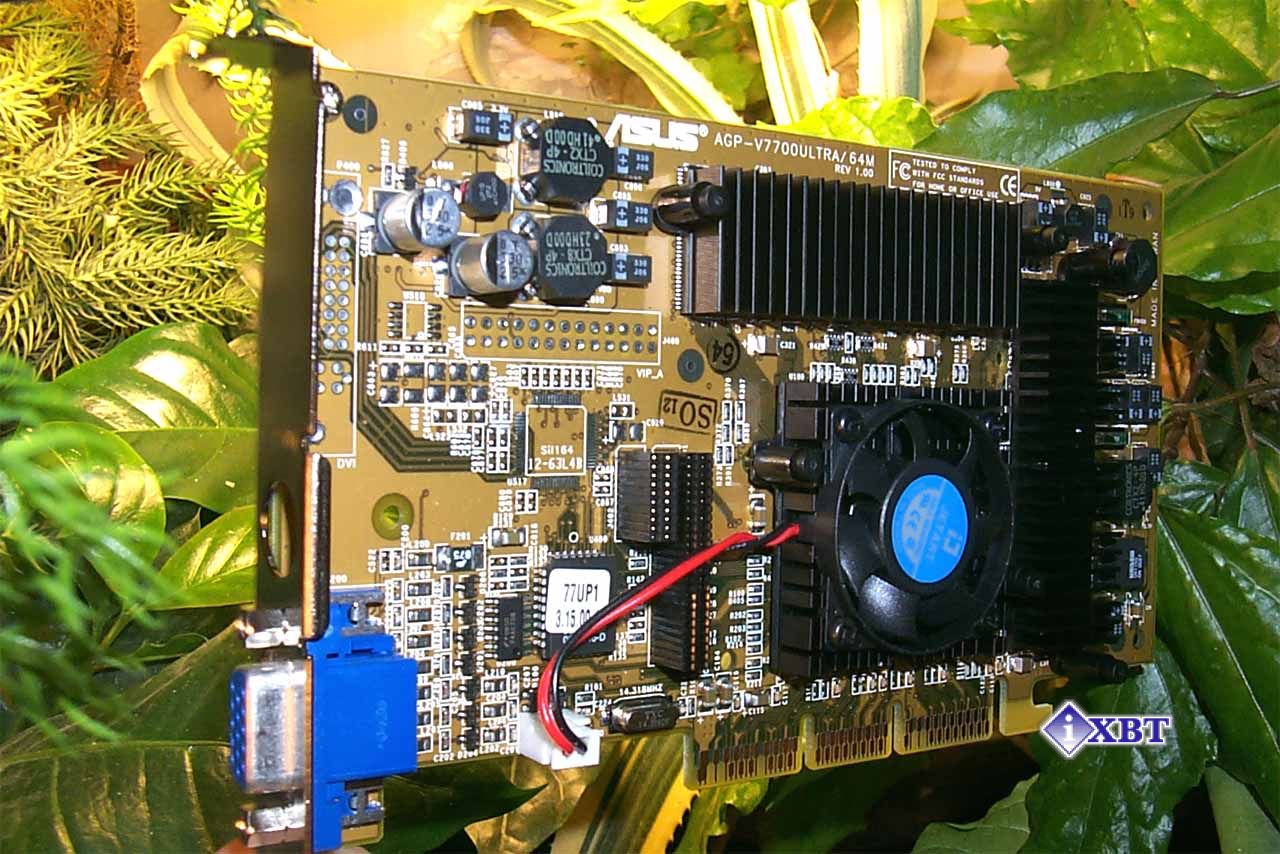 Начну с того, что ASUS AGP-V7700 Ultra это серийная карта от ASUSTeK. Карта имеет AGP x2/x4 интерфейс, 64 мегабайта DDR SDRAM памяти, размещенной в 8-ми микросхемах на лицевой стороне PCB.