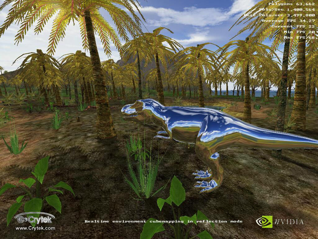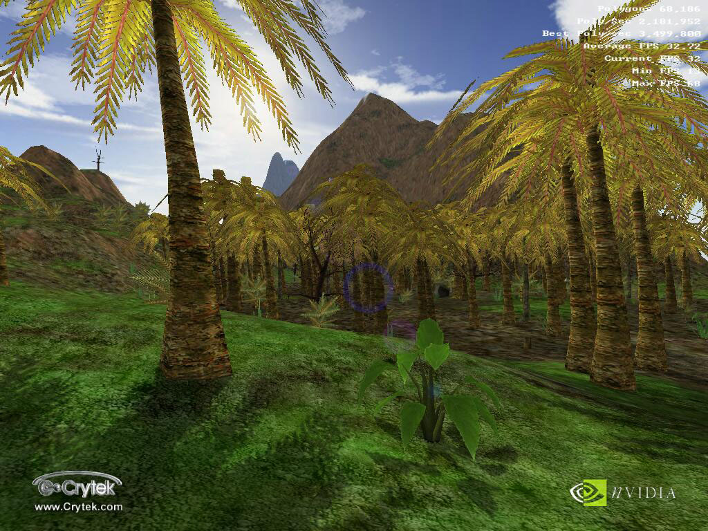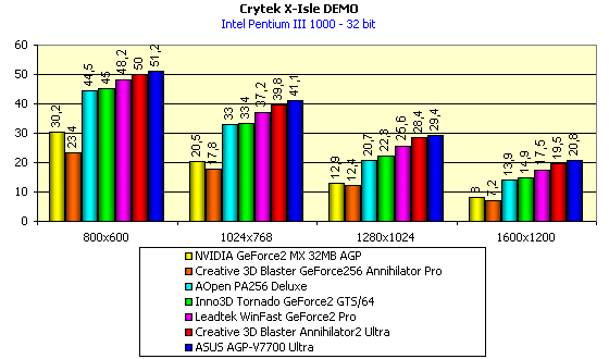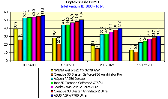 - Crytek X-Isle — игровой тест, демонстрирующий производительность Hardware TCL (T&L) в OpenGL при использовании всех последних наработок NVIDIA в 3D-графике, при наличии очень сложной графики (это нам дает возможность оценить приспособленность современных акселераторов от NVIDIA к будущим "тяжелым" играм)