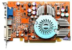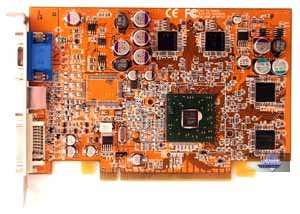 | Карта имеет интерфейс PCI-E x16, 128 МБ памяти DDR SDRAM, размещенной в 8-ми микросхемах на лицевой и оборотной сторонах PCB. Микросхемы памяти Hynix. Время выборки у микросхем памяти 2.5ns, что соответствует частоте работы 400 (800) МГц, память же работает на частоте 380 (760) МГц (заметим, что частота повыше, нежели обещано было ранее — 340 МГц). Частота работы GPU  500 MHz. Шина обмена с памятью — 128 bit. Число пиксельных конвейеров × число текстурников — 4x1. |  |