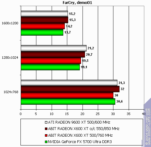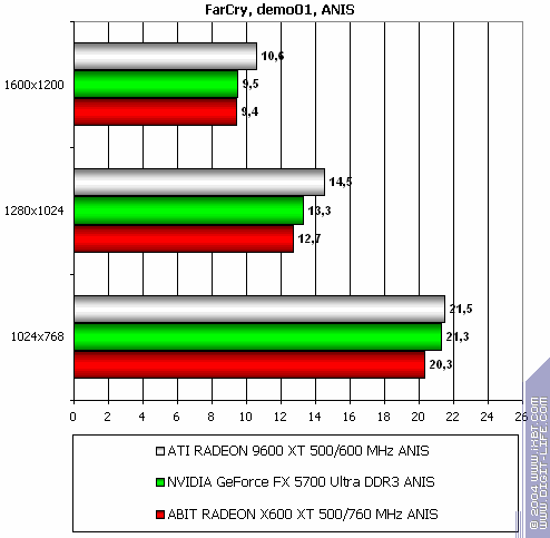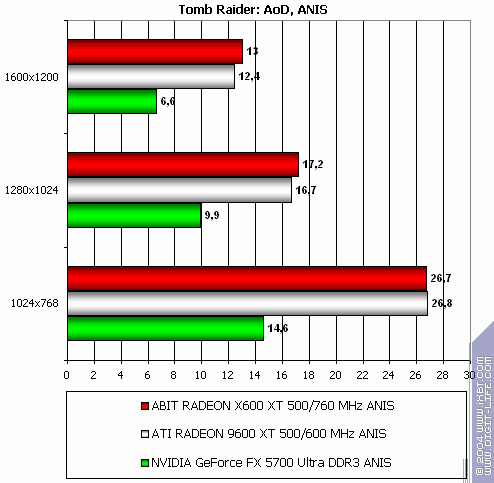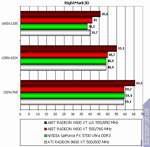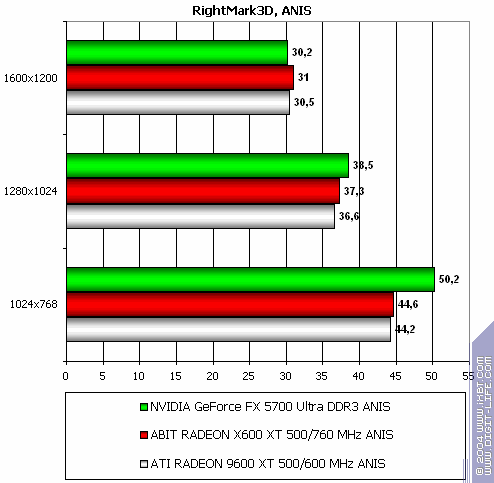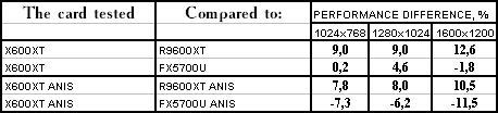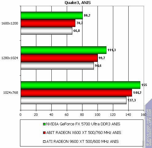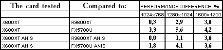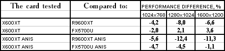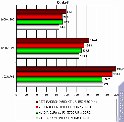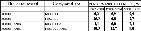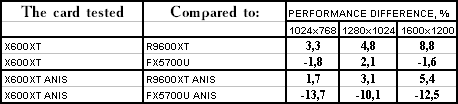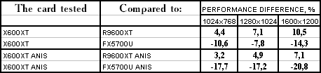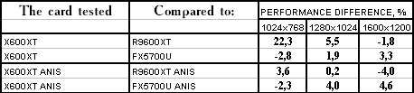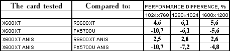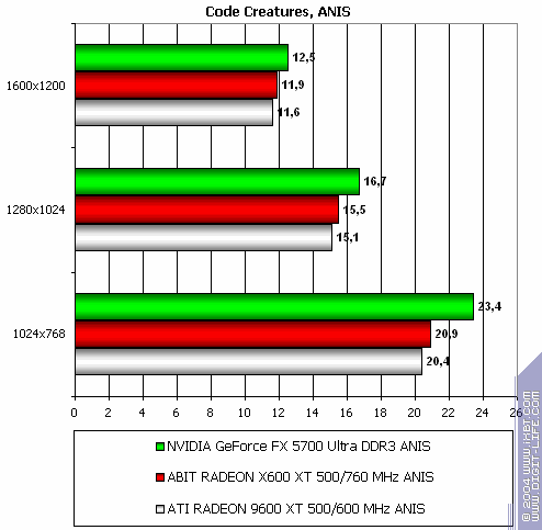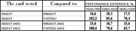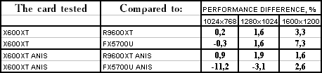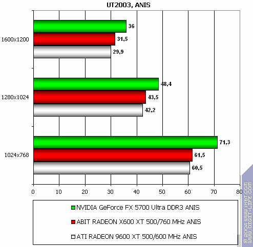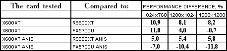 - ABIT X600 XT против NVIDIA GeForce FX 5700 Ultra  аналогично (иногда небольшая победа у первого).