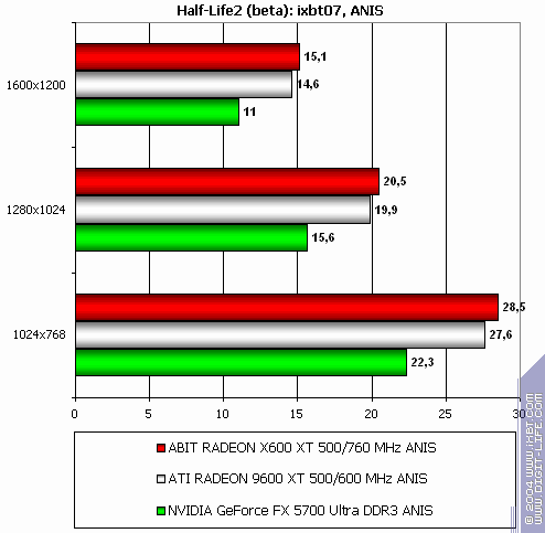 -  Half-Life2 (Valve/Sierra)  DirectX 9.0, два разных записанных demo (ixbt07 и coast). Тестирование проводилось при включенной анизотропной фильтрации.