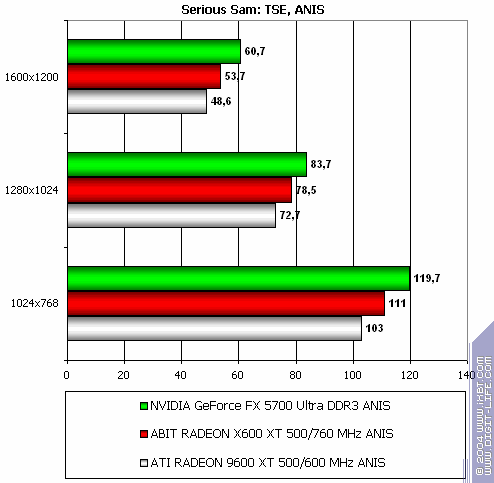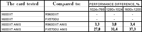 Режим с анизотропией: Обе карты (ATI) нагружены основательно, поэтому разницы почти нет (в 1024х768 лишь за счет более быстрой памяти у X600). Наблюдает небольшой перевес и над FX5700U.