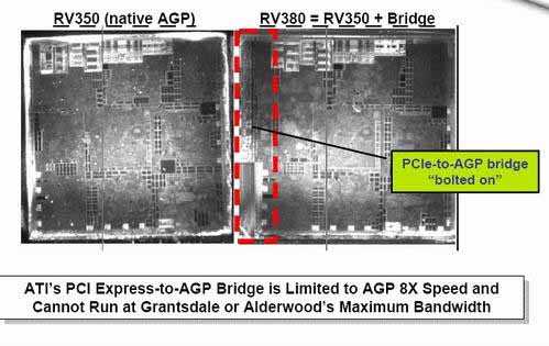 И видим, что это была полная ложь, поскольку даже банальный пересчет отношений «прироста» площади к общей площади у X600 даст цифру не более 5%, когда по фотографии, приведенной на сайте, это около 15%. Впоследствии авторы всячески открещивались от своего участия в этой инсинуации, ATI же заявила, что дополнительная площадь на кристалле — это буферы ввода-вывода нового интерфейса.
