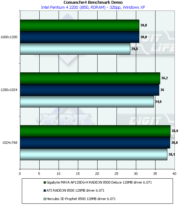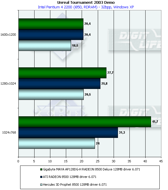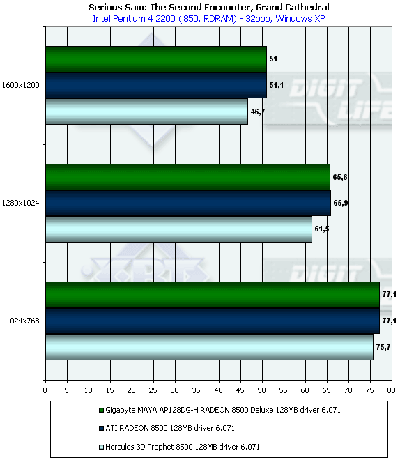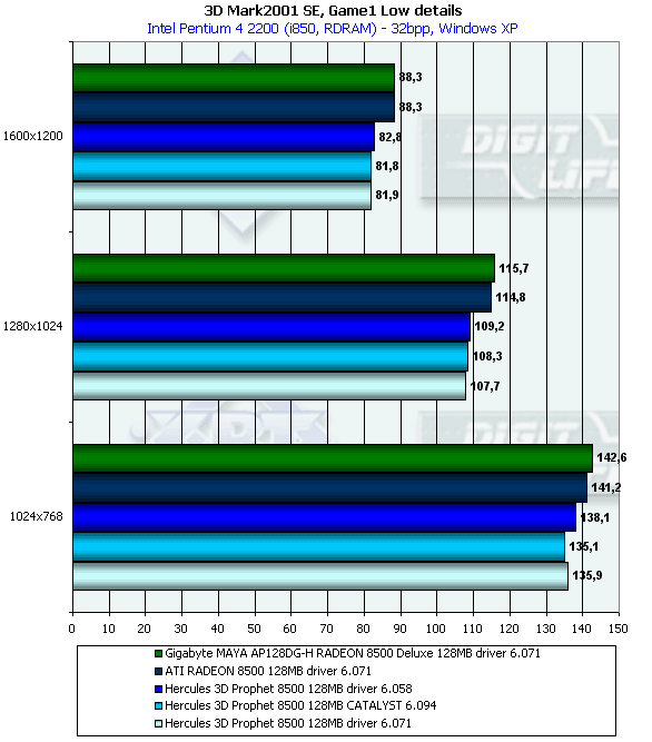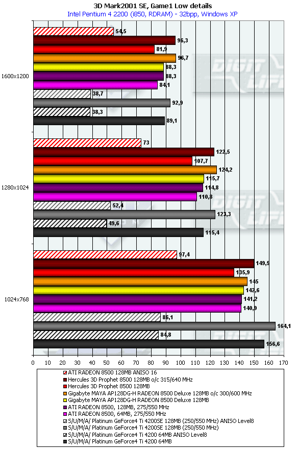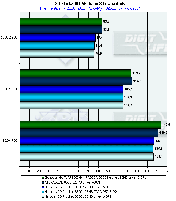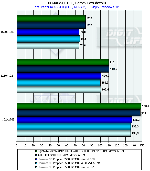 Разница в производительности между самими видеокартами на базе RADEON 8500 в данном тесте уже меньше, но она все же имеется.