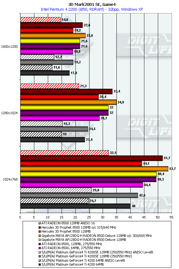 Ситуация такова: старшая S/U/M/A/ Platinum GeForce4 Ti 4200 SE 128MB является лидером в гонке, 64-мегабайтная карта от той же фирмы лидирует только вплоть до 1600х1200, а в этом разрешении уже силы равны с Gigabyte MAYA AP128DG-H RADEON 8500 Deluxe 128MB. Видеокарта от Hercules идет чуть ниже. Однако, повторю, что анизотропия вновь выводит карты на базе RADEON 8500 в чемпионы.