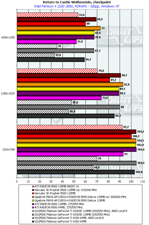 - Return to Castle Wolfenstein (MultiPlayer) (id Software/Activision) OpenGL, мультитекстурирование, Checkpoint-demo, настройки тестирования все на максимально возможном уровне, S3TC OFF, конфигурации можно скачать тут