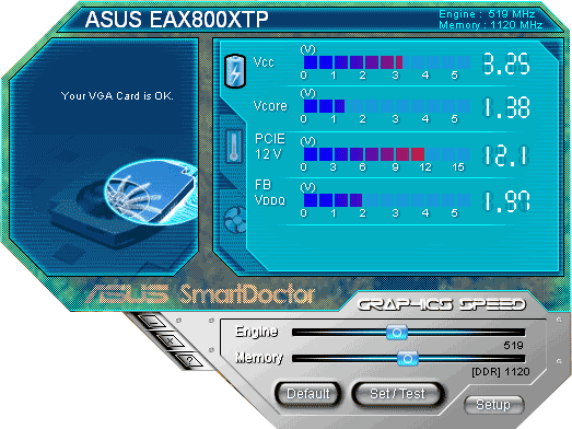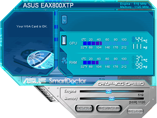 Как известно, одной из старейших фирменных утилит, постоянно сопровождающей карты от ASUS, является SmartDoctor. Последняя версия на момент написания обзора — 4.60. Она единая для обеих карт. Но реализована по-разному. Так она выглядит для карты на базе GeForce 6800 Ultra: