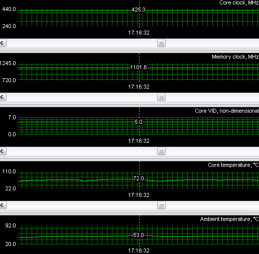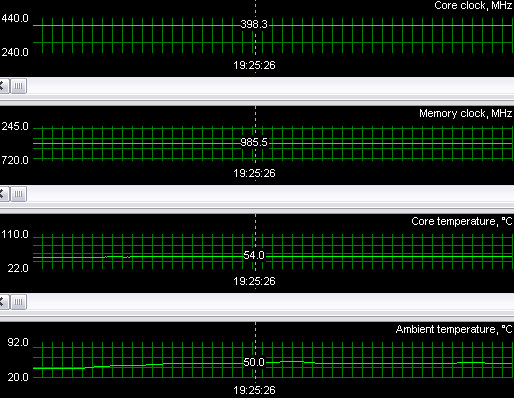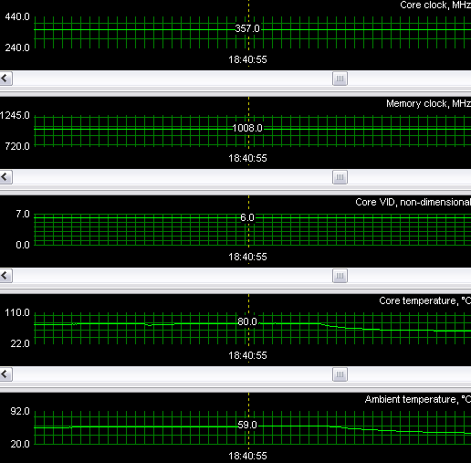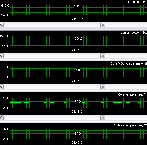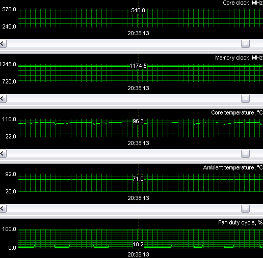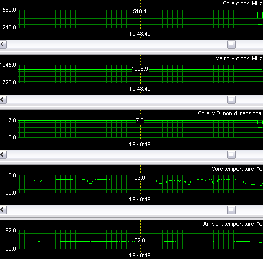 Ужас не менее аналогичный! Перегрев (в нашем понимании) налицо, хотя, как мы видим, кулер выше 19% от своих номинальных оборотов не поднимал. Однако плата работала стабильно, нареканий не было. Должен сказать, что по предварительным исследованиям кулер включается на полные 100% оборотов только при температуре около 100 градусов. Поэтому или чип рассчитан на такие температуры, или в показания датчиков софтверно внесены коррективы, показывающие более высокую температуру.