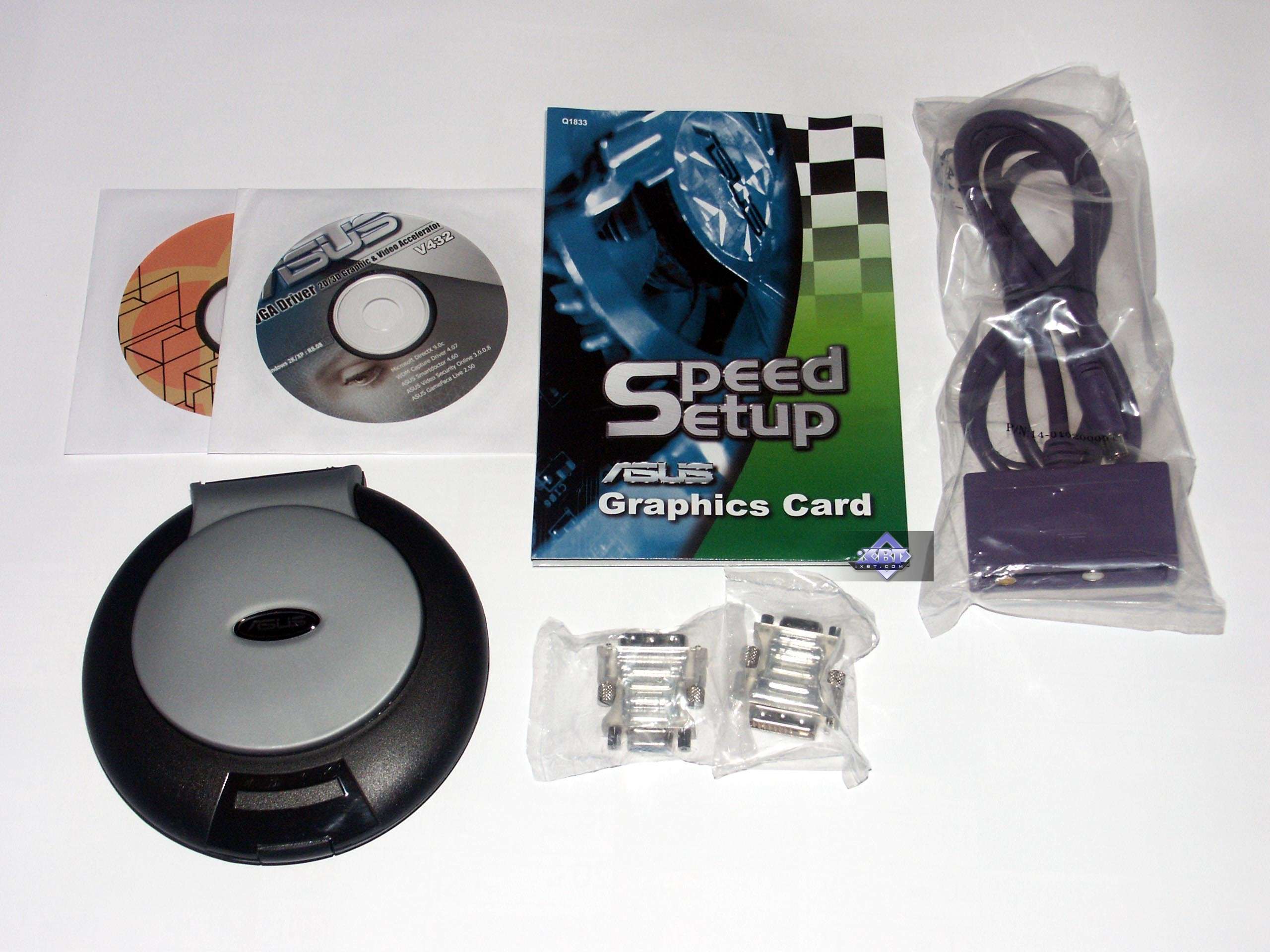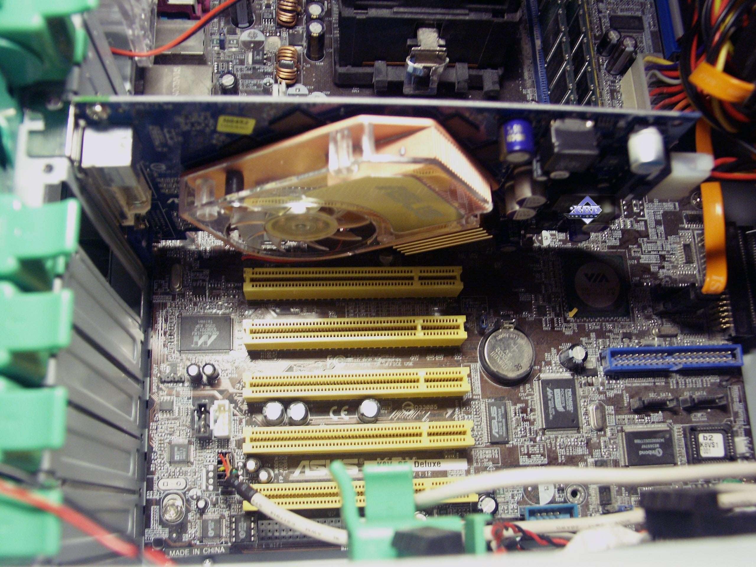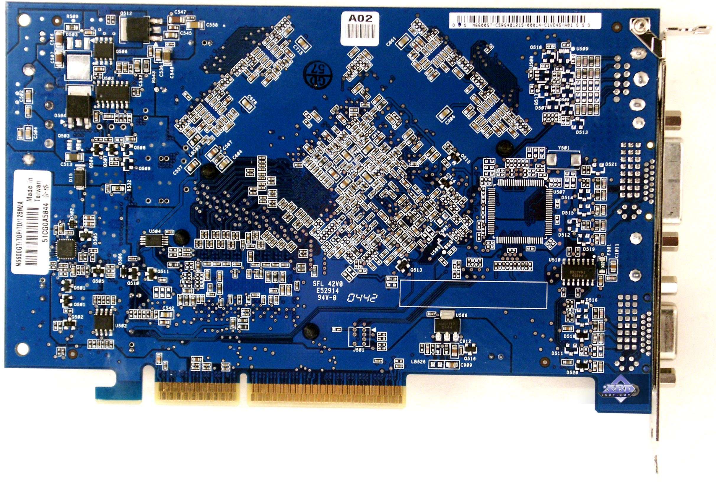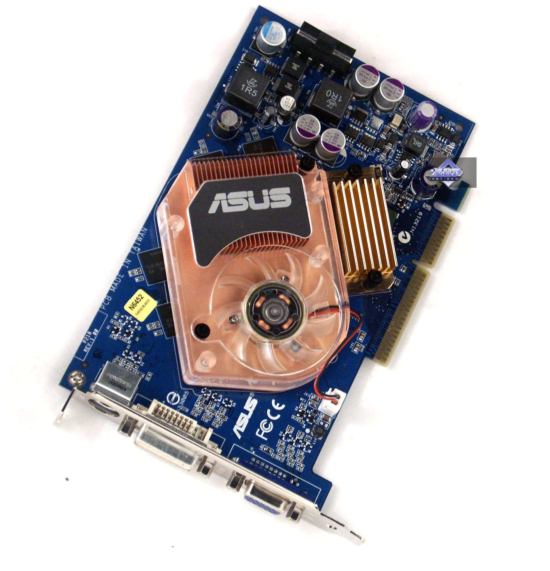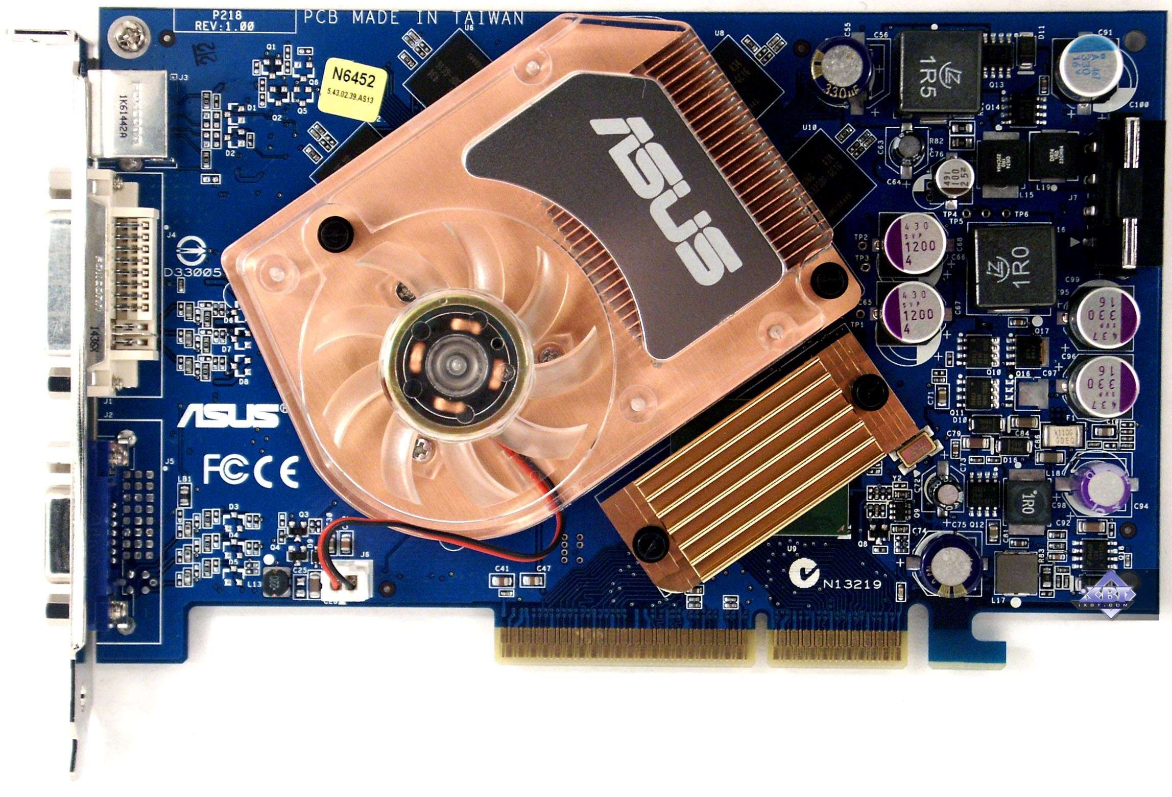 - ASUS N6600GT 128MB AGP — сам ускоритель ничем особенным не выделяется, полная копия эталонного дизайна, но вот то, что кулер медный, да и память 1.6ns — это очень привлекательно для оверклокеров. К тому же данный экземпляр разогнался до 577/1230 МГц! Качество 2D в 1600х1200 при 85 Гц — отлично. Однако надо иметь в виду, что нагрев карты очень высок, и потому обдув или иные способы охлаждения очень нужны.