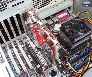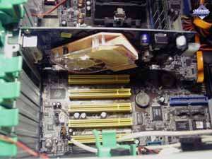 Хоть кулер тонкий, все равно требуется прилично свободного места вокруг карты для улучшения охлаждения. Насчет шума — все аналогично предыдущему продукту, только шум усилен: сказывается узость корпуса радиатора. Посмотреть видеоролик и оценить шум можно по этой ссылке (2.9MB, AVI DivX 5.1). | ![]() |