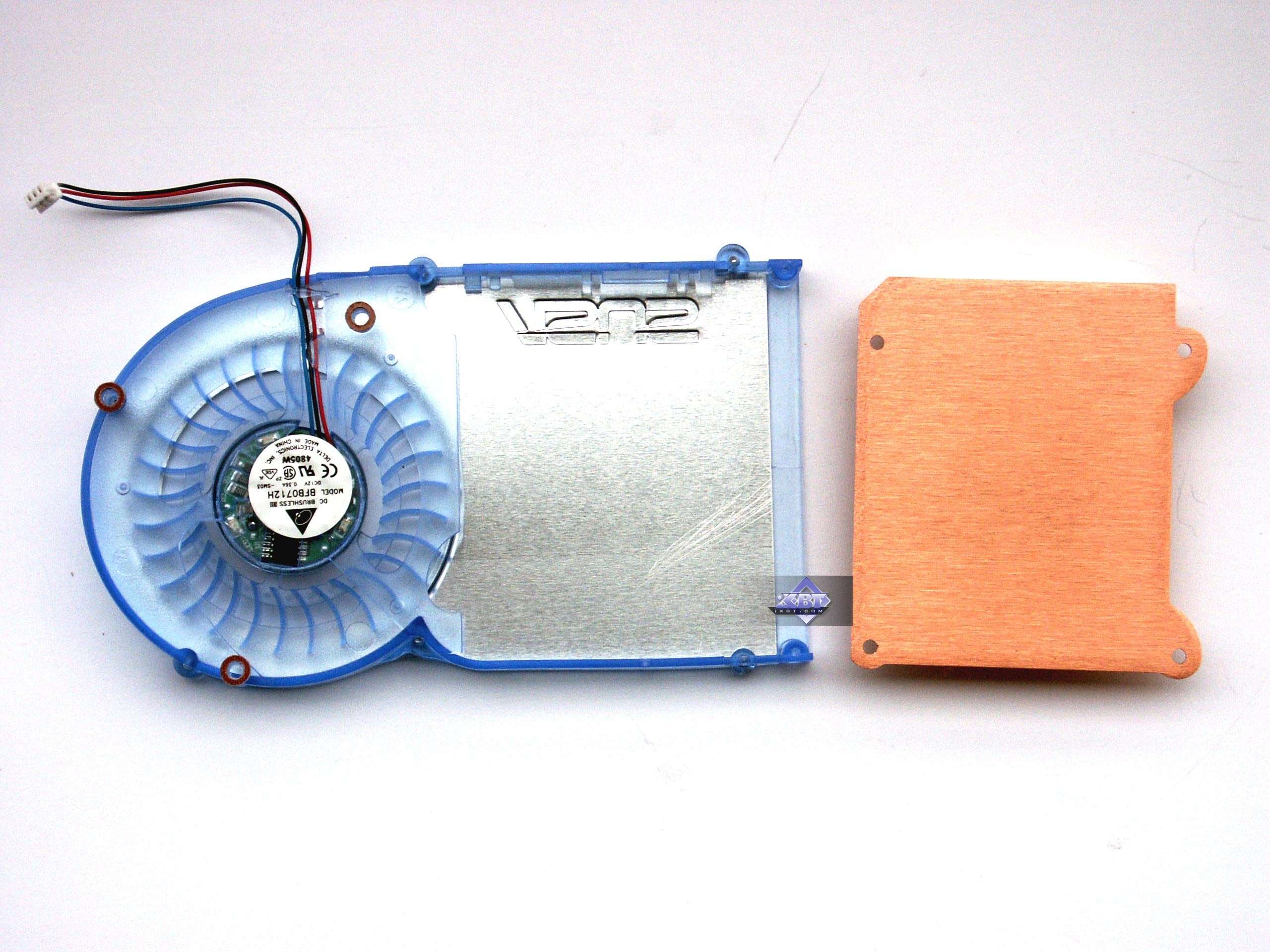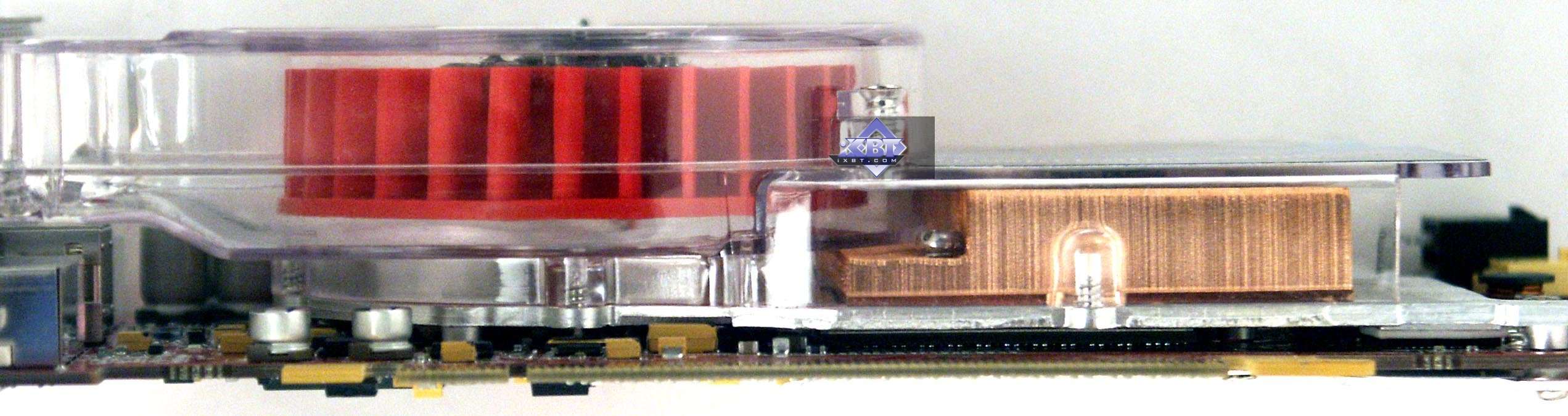 Рев этой турбины уже известен по предыдущим материалам, посвященным аналогичной карте. Но он слышен только при запуске компьютера, а после нескольких секунд резко уменьшается. Посмотреть видеоролик и оценить шум можно по этой ссылке (3.3MB, AVI DivX 5.1). | ![]() |