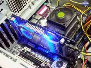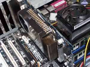 Кулер двухслотовый, поэтому карта занимает приличное место в системном блоке (надо учитывать еще, что требуется много пустого пространства вокруг для хорошего охлаждения акселератора. Шум при старте весьма сильный, уменьшается только через 5-8 минут после работы в 2D-режиме. Посмотреть видеоролик и оценить шум можно по этой ссылке (2.6MB, AVI DivX 5.1). | ![]() |
