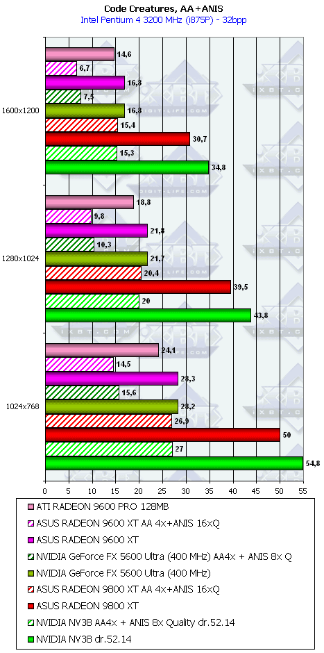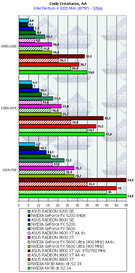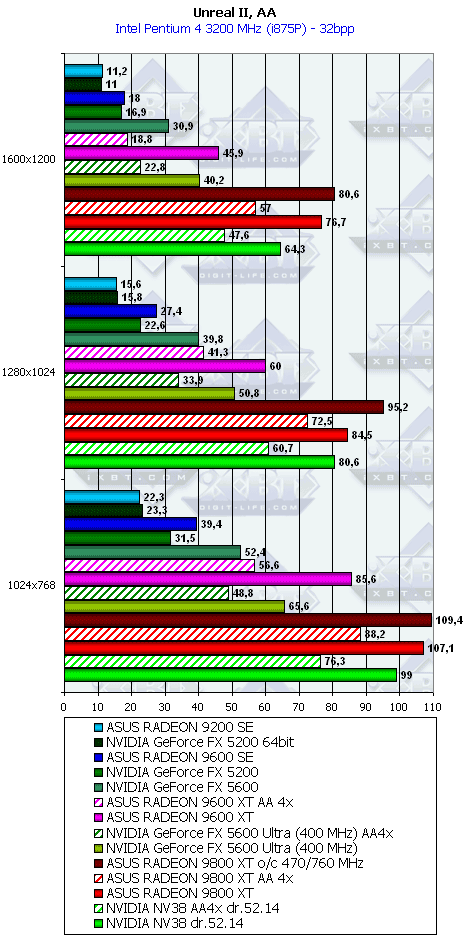 ASUS RADEON 9600 XT 128B легкая победа, кроме 1600х1200 (впрочем, на такой карте в таком разрешении при АА никто играть и не будет)